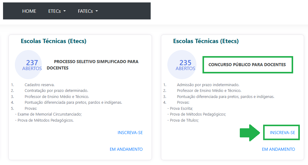 • 4 – Rolar a página para baixo até encontrar “Escolas Técnicas (Etecs)”, “CONCURSO PÚBLICO PARA DOCENTES” e clicar em “INSCREVA-SE” (ou, se já tiver feito sua inscrição, clicar em “EM ANDAMENTO”);