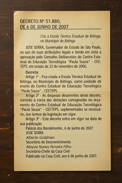 DATA: 06/06/2007 – Em 06/06/2007, ocorreu a Criação oficial, por decreto do então governador José Serra, da Escola Técnica Estadual de Ibitinga, como parte do Centro Paula Souza. A publicação saiu no Diário Oficial no dia seguinte e marcou o início da nossa Etec, fruto de aprovação pelo Conselho Deliberativo em 2006 (Publicado no D.O.E. de 7 de junho de 2007 (quinta-feira), Caderno Executivo, Seção I, página 3 e 4).