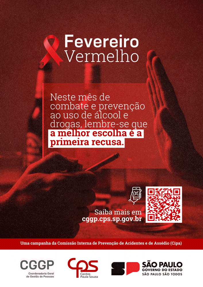 DATA: 09/02/2026 – No mês de Fevereiro CGGP (Coordenadoria Geral de Gestão de Pessoas) do CPS divulga a campanha Fevereiro Vermelho, que é dedicada ao combate e à prevenção do uso de álcool e outras drogas, devido ao Dia Nacional de Combate às Drogas e ao Alcoolismo (20 de fevereiro), a fim de conscientizar sobre os riscos do consumo de substâncias (lícitas ou ilícitas) e fortalecendo políticas de cuidado e reabilitação.