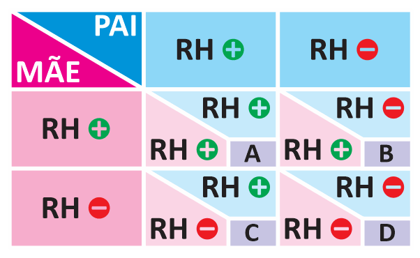 A partir do cruzamento entre os genes dos pais, representado acima, é possível calcular a probabilidade de ocorrência de certas características nos filhos, nele vemos que, diante dos 4 tipos de cruzamentos (A, B, C e D), há 75% de chance de o bebê nascer Rh Positivo (cruzamentos A, B e C) e 25% de ser Rh Negativo (cruzamento D), tendo em vista o Fator Rh Positivo Dominante.