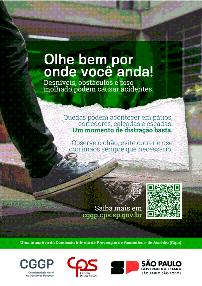 DATA: 16/03/2026 – As quedas são uma das maiores causas de afastamento no Centro Paula Souza, ocorrendo principalmente por tropeços, escorregões ou distração. Para reduzir esses índices, a CIPA (Comissão Interna de Prevenção de Acidentes e de Assédio) reforça a importância da prevenção e do registro correto de acidentes (mesmo nível ou diferença de nível) na CAT.